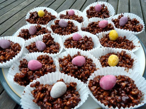 Spoon into cupcake cases and add a cluster of mini eggs to resemble a nest. Put into the fridge to cool and set.