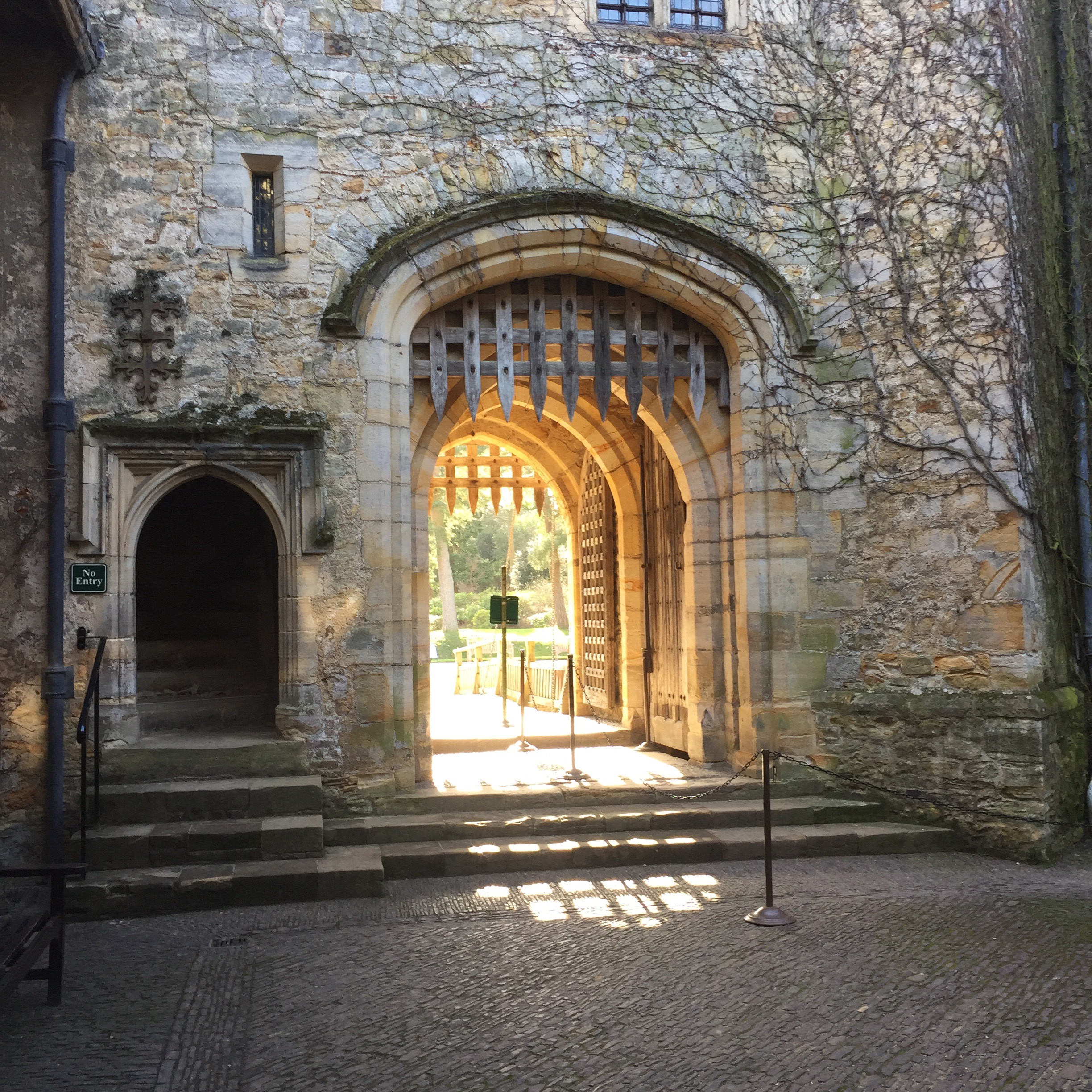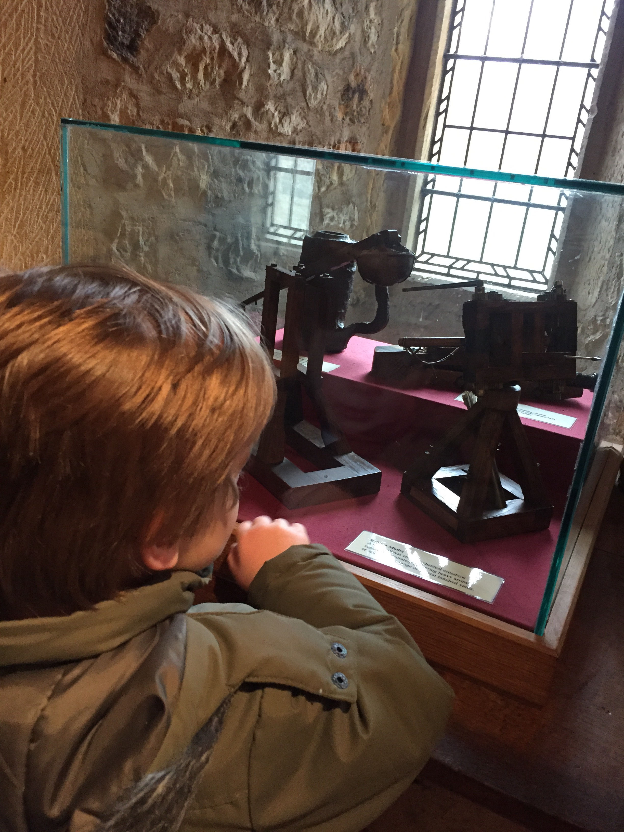 Yes!! That will do for me. The swords were used in battle and “for wearing with your armour and shield” and axes were for “chopping wood up so you could be warm”. We hurried past the bridles, scolds and flays “is that a tickling stick?” and he became fascinated by the portcullis mechanism and the drawbridge.